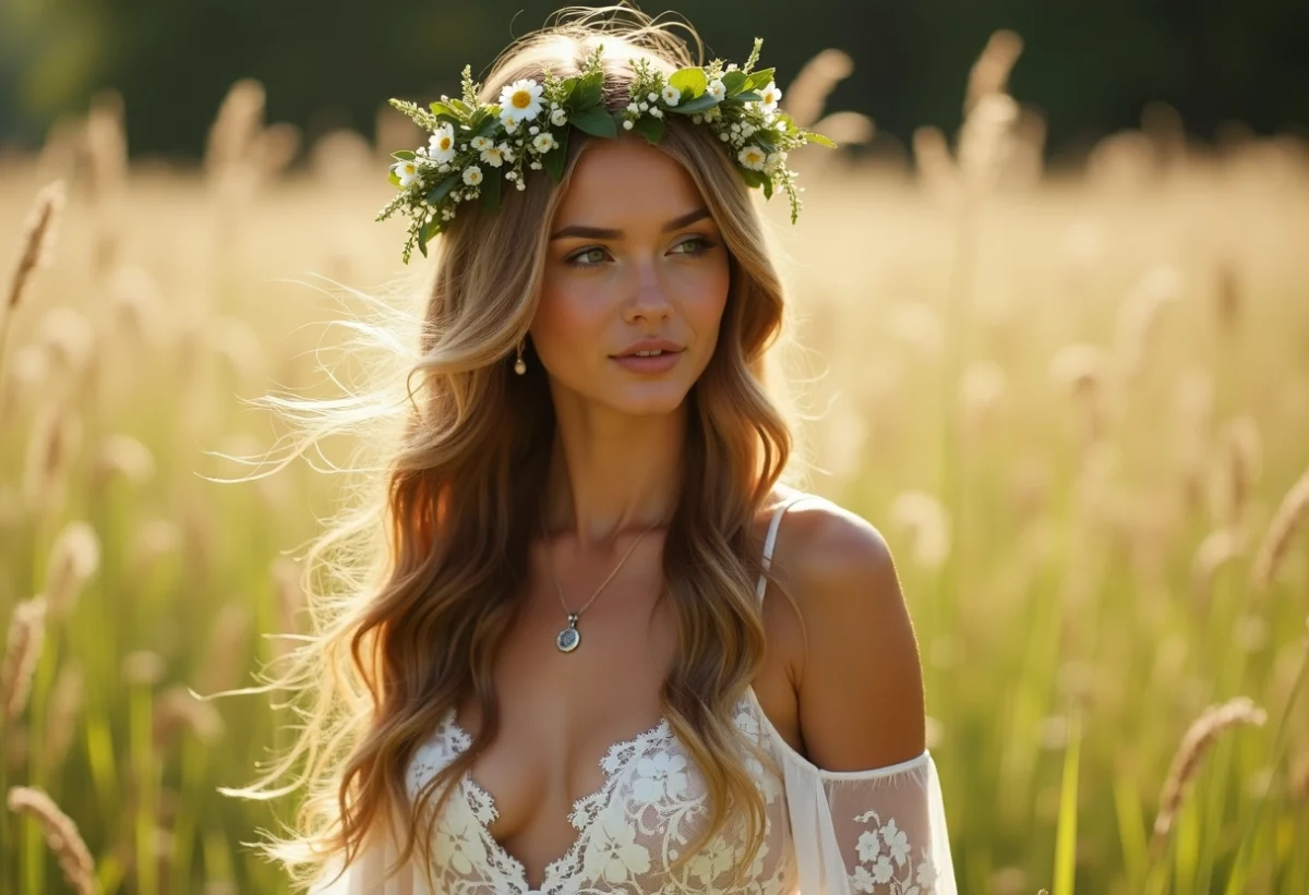 - Pour les cheveux longs, les options sont nombreuses : tresses lâches, chignons flous, ondulations naturelles. Cette longueur permet de jouer avec le volume et la texture tout en restant dans le thème bohème.
