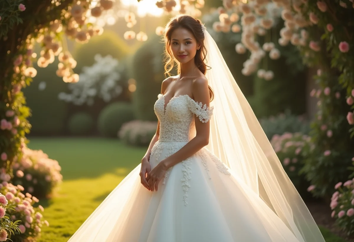 - Robe de mariée en tulle : Le tulle, léger et aérien, est parfait pour créer des volumes sans alourdir la silhouette.