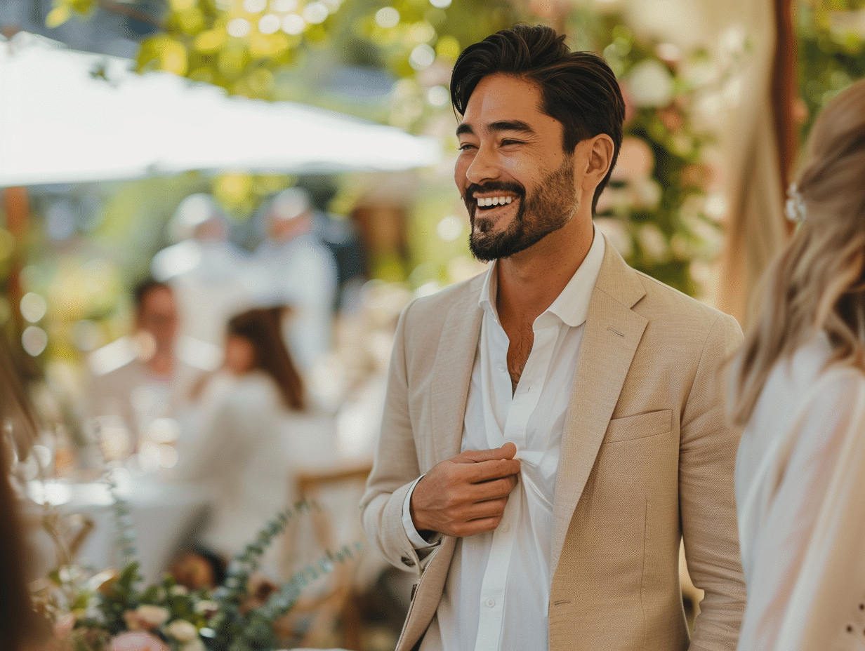 Pour une élégance sans costume, harmonisez les pièces de votre tenue en privilégiant les matières nobles et les coupes impeccables. Optez pour des couleurs sobres et élégantes, telles que le noir, le blanc, le bleu foncé, le gris ou le beige, qui sont recommandées pour un mariage. Les matières comme le coton de qualité, le lin, le cachemire ou la soie vous distingueront par leur raffinement. Accordez une attention particulière aux essayages, car des vêtements bien ajustés sont essentiels à une allure distinguée, même en l’absence de costume.